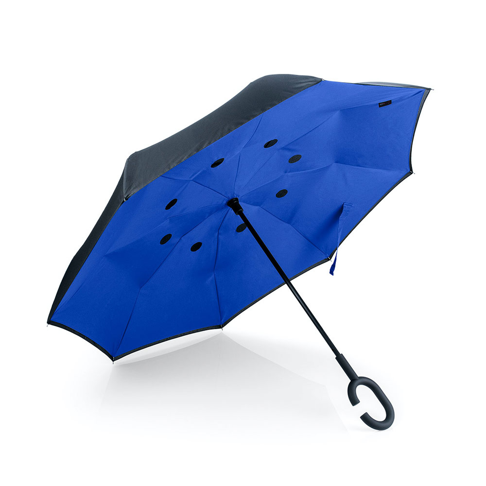Paraguas en 2 tonos reversible, 8 cascos, costillas en metal y fibra de vidrio, vara metálica, tela en Pongee con cinta para cierre con velcro, mango tipo C con acabado en goma que permite ser usado como manos libres. Gracias a su mecanísmo de plegado inverso, es capaz de contener el exceso de agua.